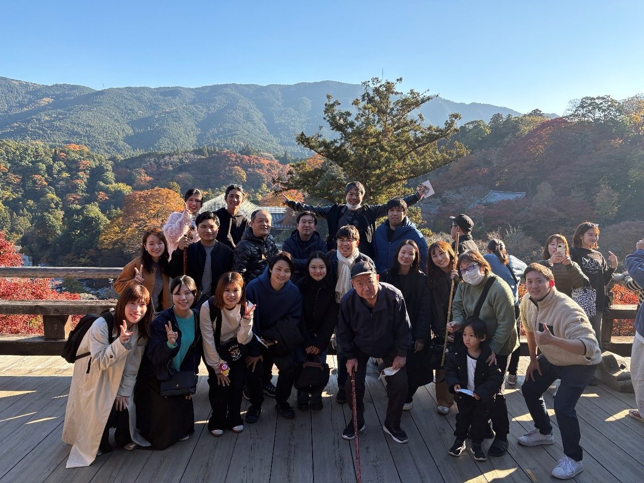 全長399段の階段は後半になるほど段差が大きくなり、運動不足気味の私には少しきつく感じましたが、参加者全員で本堂まで登り切ることができました。本堂からの眺めは格別で、紅葉に彩られた境内はまさに「花の御寺」の名にふさわしい美しさでした。